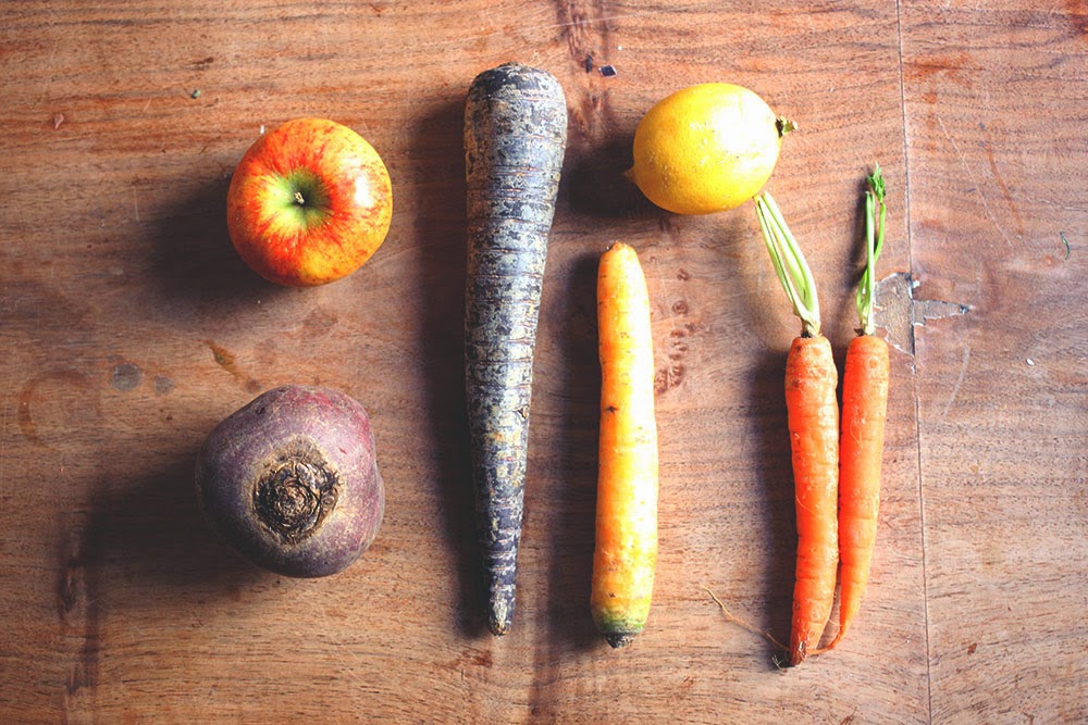 Als erstes den Apfel, die gelbe Karotte und die „normale“ Karotte waschen und grob raspeln oder sehr klein schneiden. Dann die violette Karotte und die Rote Bete schälen und ebenfalls grob raspeln oder klein hacken. Die Reihenfolge verhindert, dass am Ende alles rot gefärbt ist.