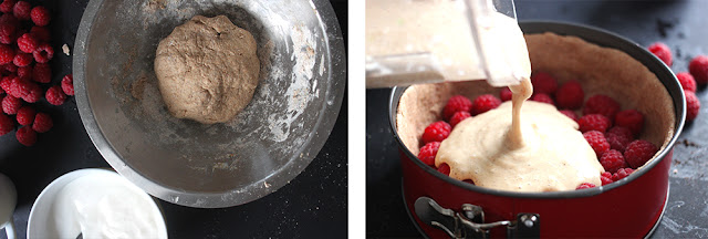 Jetzt den Teig in eure Springform (ich hab eine kleine, ca 18 cm, benutzt) drücken und einen hohen Rand formen. Die Himbeeren auf dem Boden verteilen und die Pudding Masse darüber gießen. Im vorgeheizten Ofen bei 180 Grad ca 50 Minuten backen und vor dem Genießen kalt werden lassen. Das wars auch schon, gar nicht schwer und echt lecker (: Wegen dem fehlenden Fett kann man den Kuchen gefühlt auch ganz alleine verputzen!